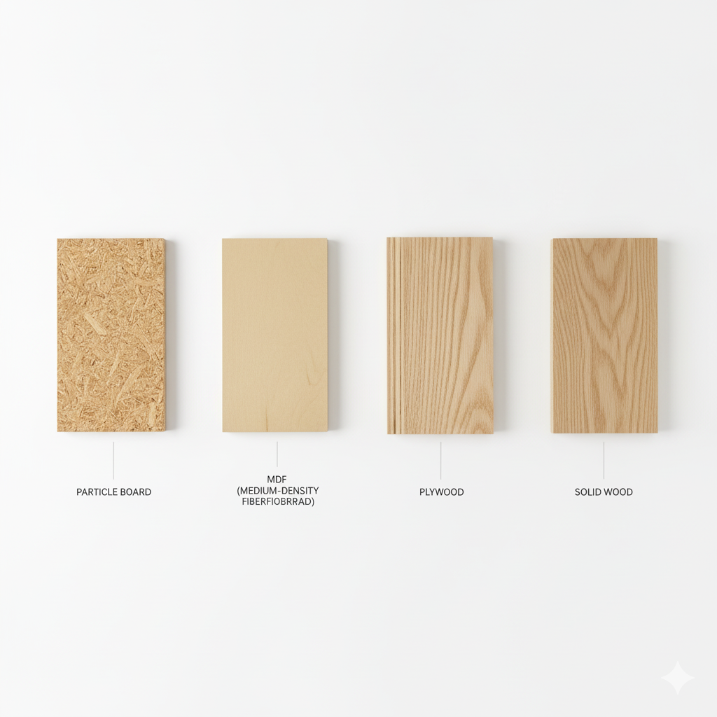 - Particle Board: Paling murah, tapi tidak kuat menahan beban berat.